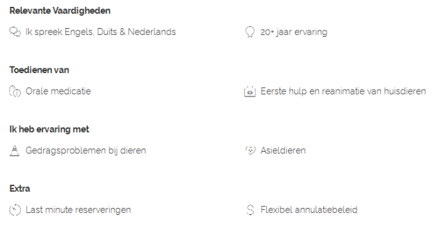 Je bent niet alleen dol op dieren, je hebt ook uitgebreide ervaring met de verzorging ervan. Dat kan ervaring zijn op professioneel gebied, maar ook als ervaringsdeskundige: omdat je zelf jarenlang honden hebt gehad, bijvoorbeeld. Zorg in elk geval dat de specifieke ervaring die je hebt goed aansluit bij de diensten die je aanbiedt: als je vooral ervaring hebt met katten is het niet logisch om je diensten aan te bieden als hondenuitlaatservice. Beschrijf in je profiel zo gedetailleerd mogelijk welke ervaring je hebt met dieren en wat die precies inhoudt. Je kunt ook invullen of je specifieke vaardigheden hebt zoals bijvoorbeeld hondentraining, EHBO, gedragsproblematiek enzovoort.